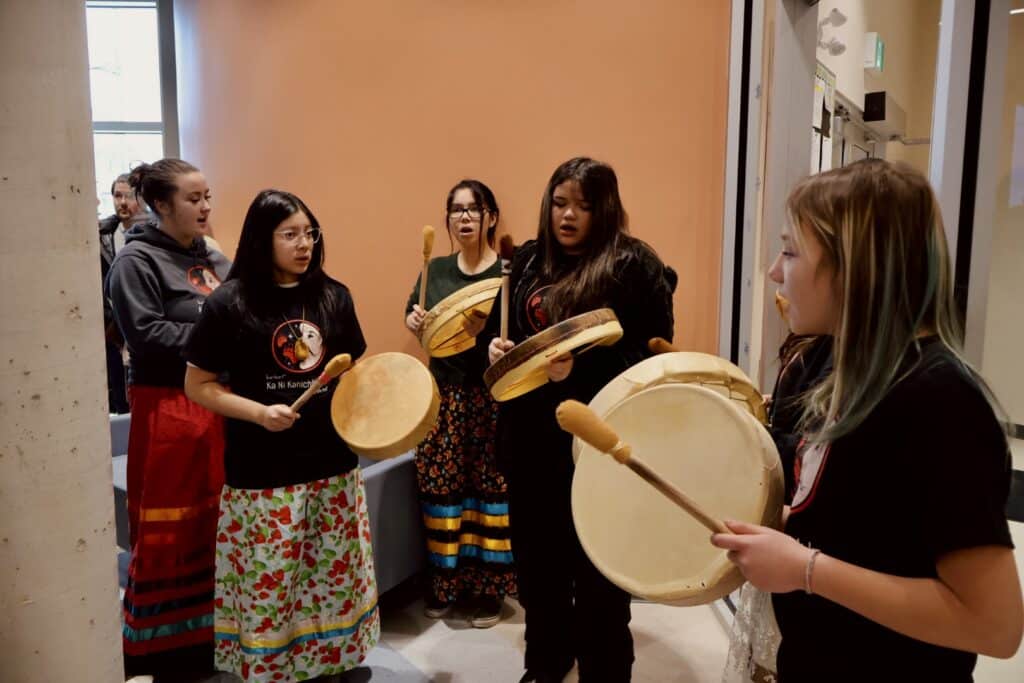 Following the mural unveiling there was a Ribbon Cutting Ceremony; Council Elder Don Robinson, Fundraising & Campaign Coordinator Cathy Menard, Ka Ni Kanichihk Founder Leslie Spillett, Executive Director Jackie Andersen, and Council Co-Chair Herb Zobell performed the official honor of cutting the ribbon on our official opening at our expanded site, 455 McDermot. Following the Ceremony, a hand drum song was shared by the Butterfly Club and Ka Ni Kanichihk staff to honour the ceremony.